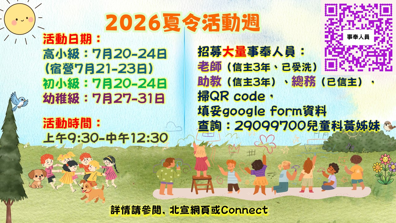 大量:老師(信主3年、已受洗)、助教(信主3年)、總務(已信主)。請登入google link,填妥資料。查詢:29099700兒童牧養科幹事。