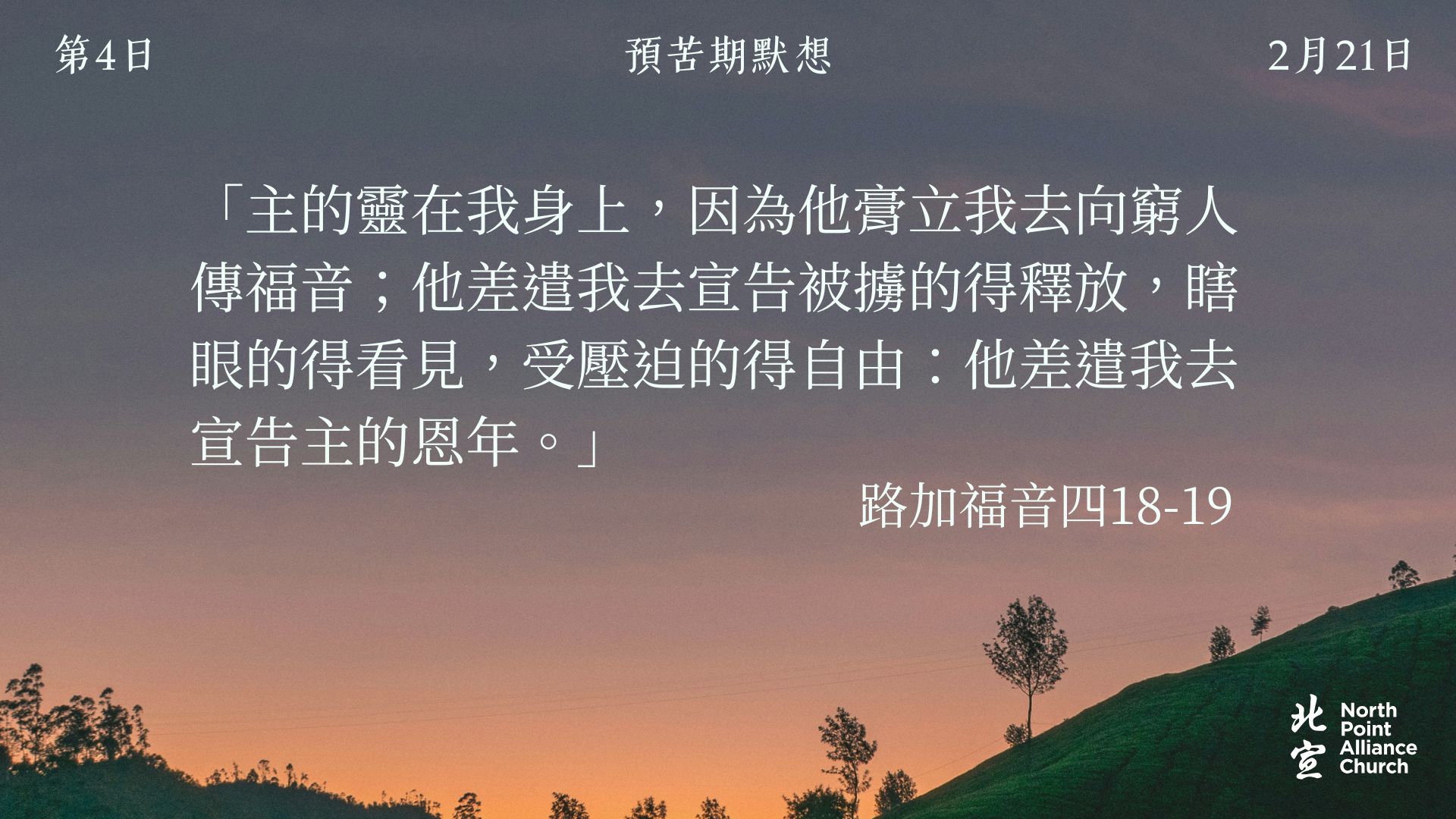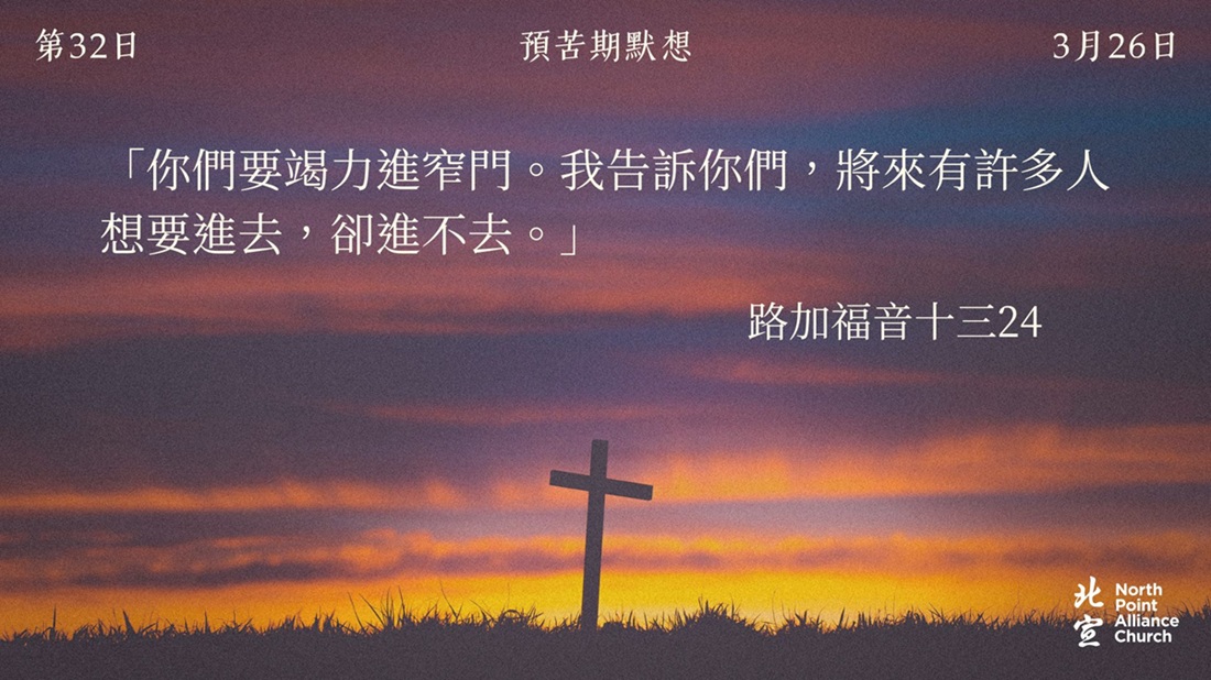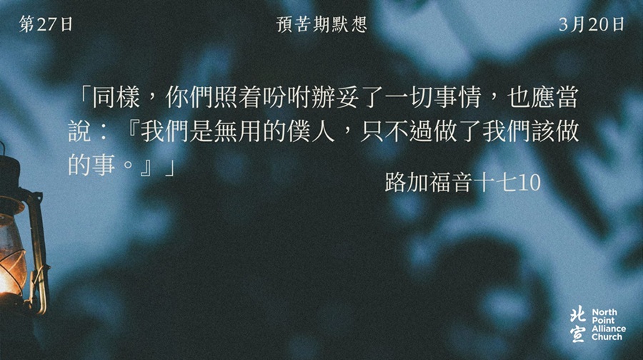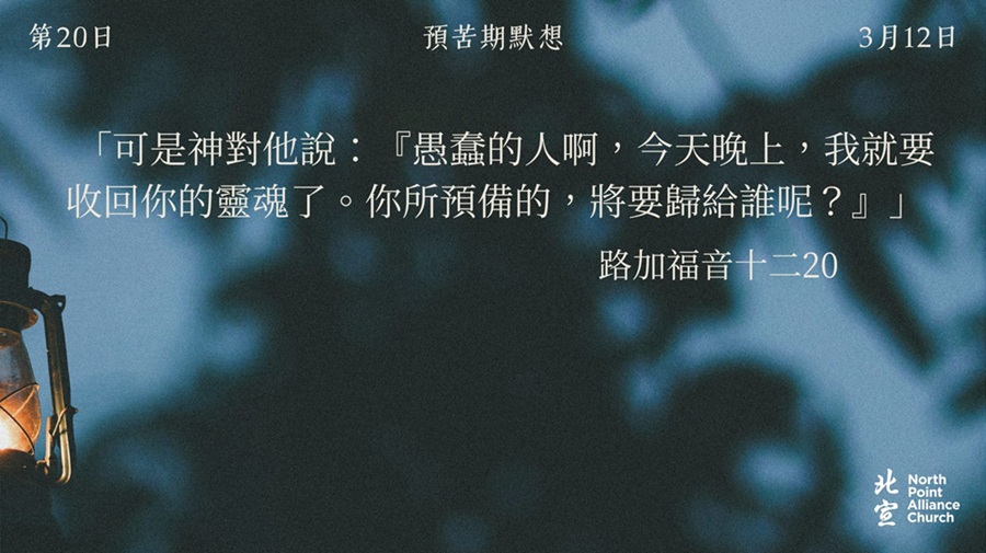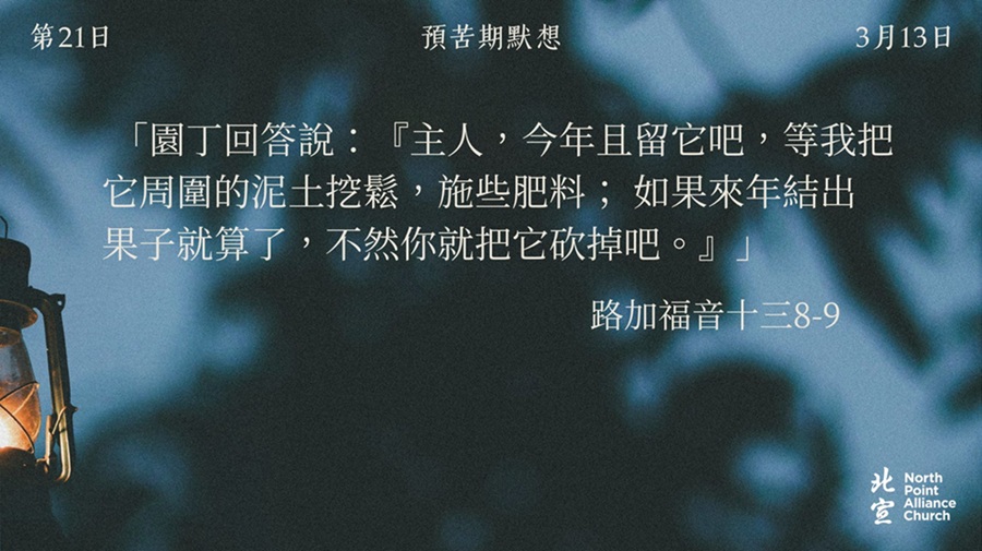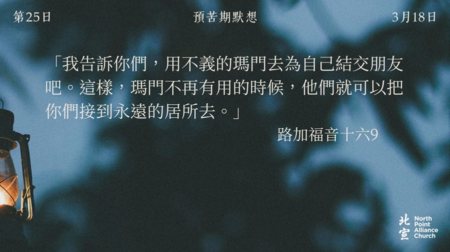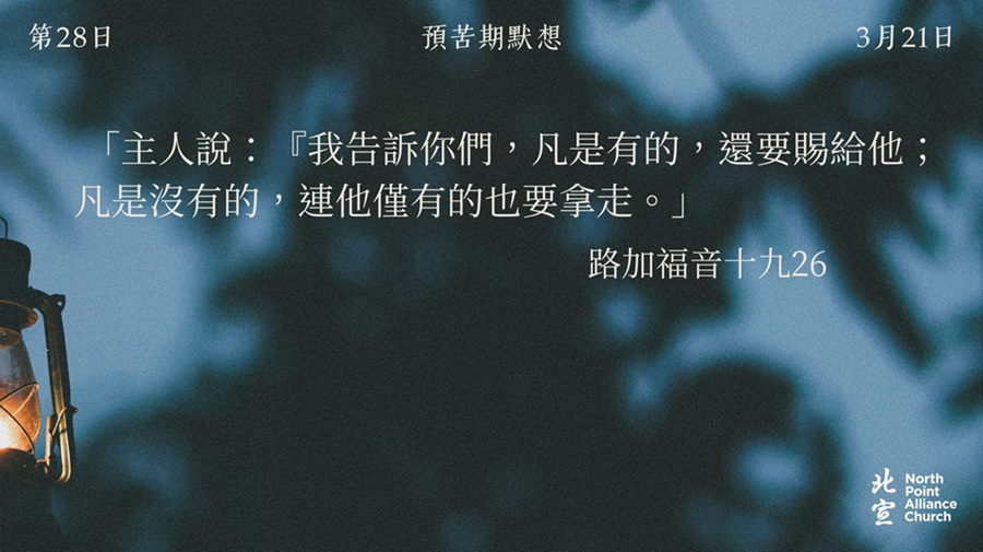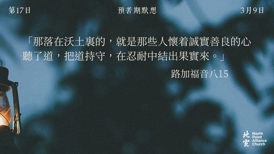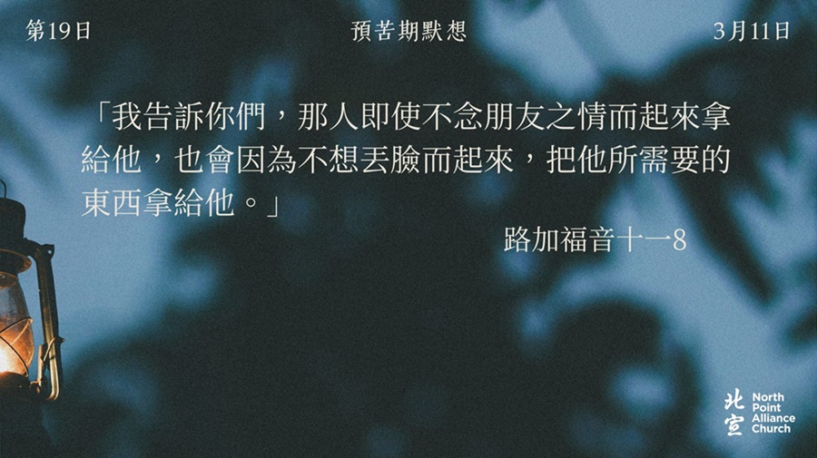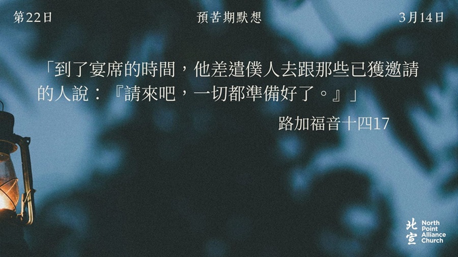 40 天的默想材料將透過北宣網頁和北宣 Connect 每天發放(主日除外),鼓勵弟兄姊妹在期間作「捨棄」或「簡樸」的操練(例:禁食、食素、捨棄一些日常的享受等),實踐在簡樸的操練中儆醒禱告。