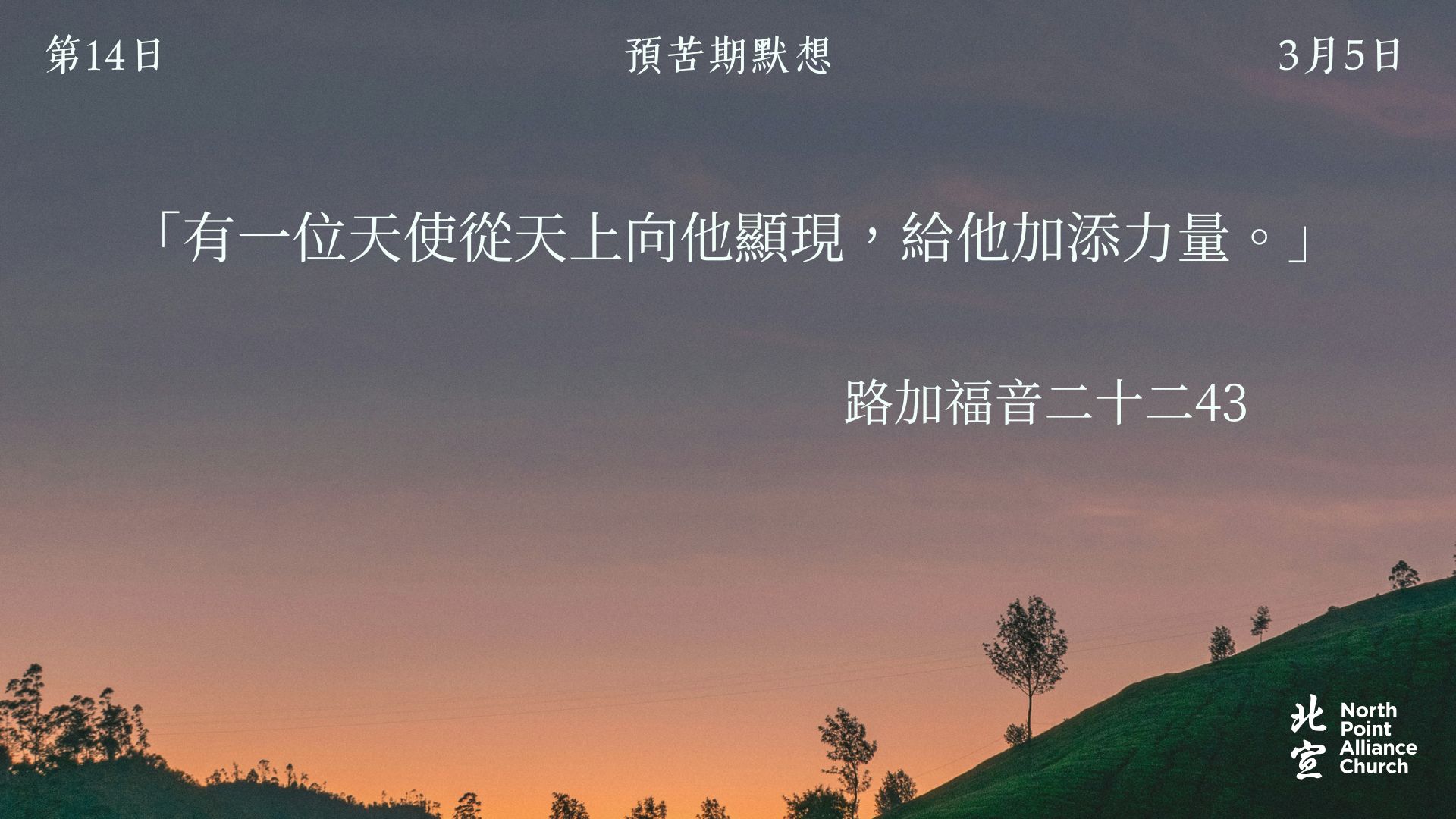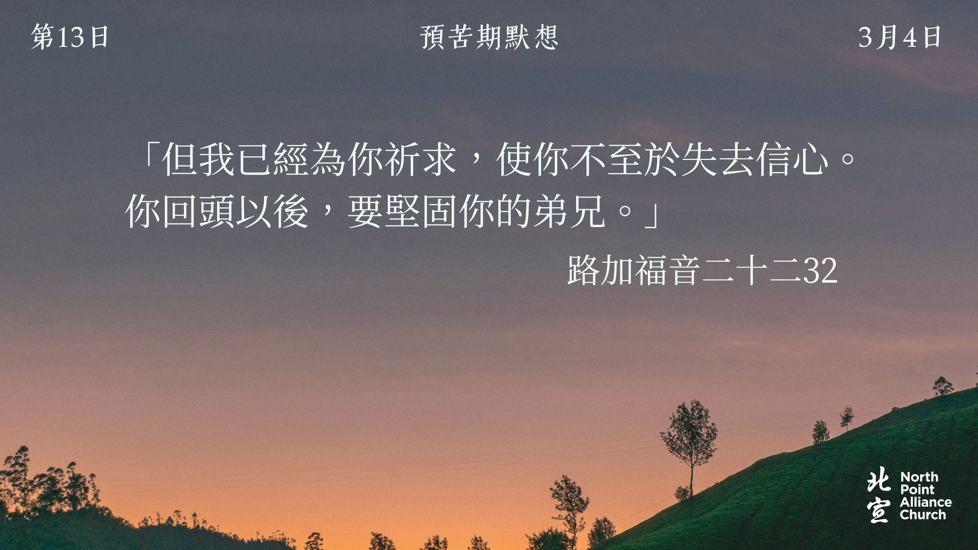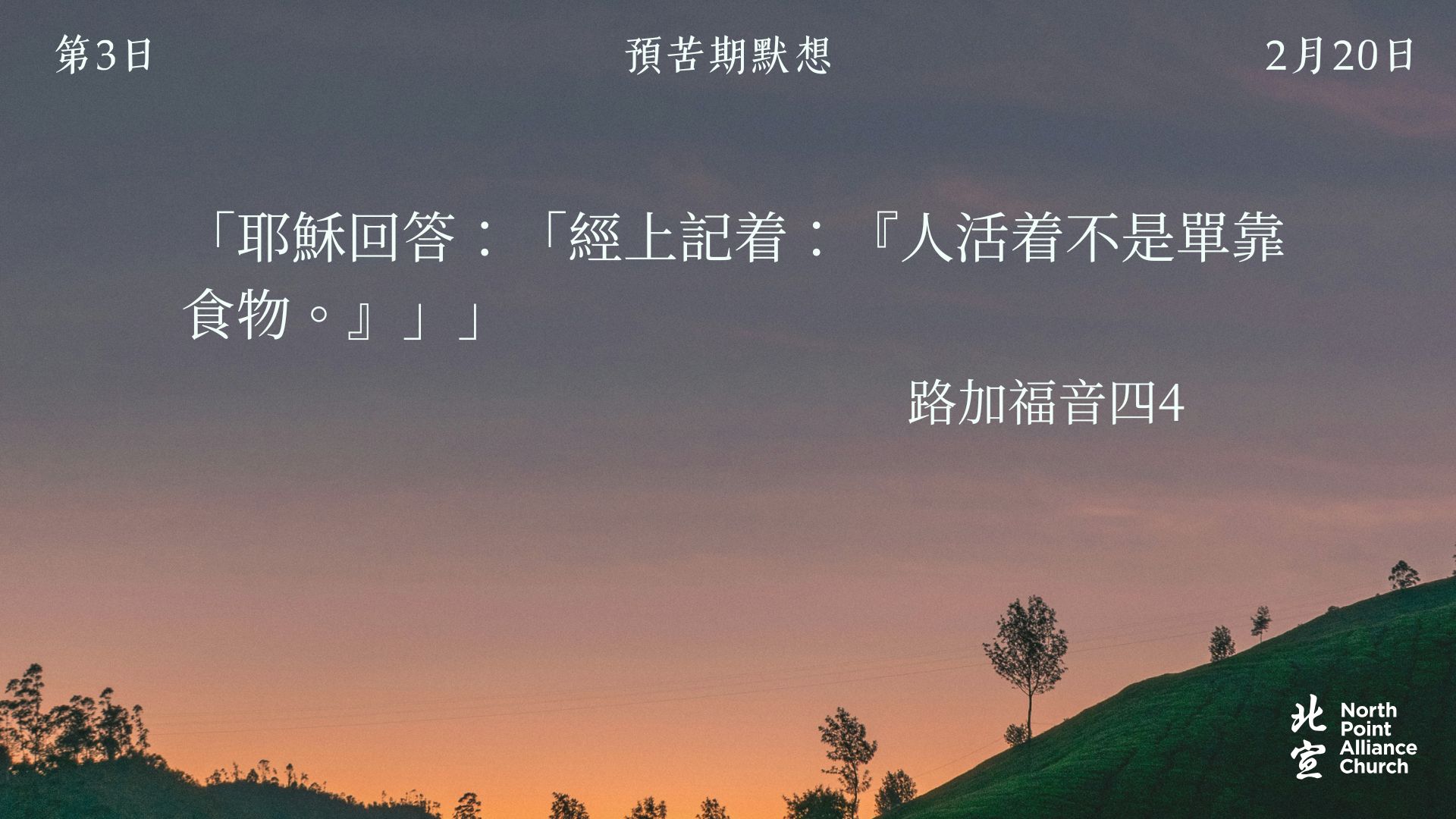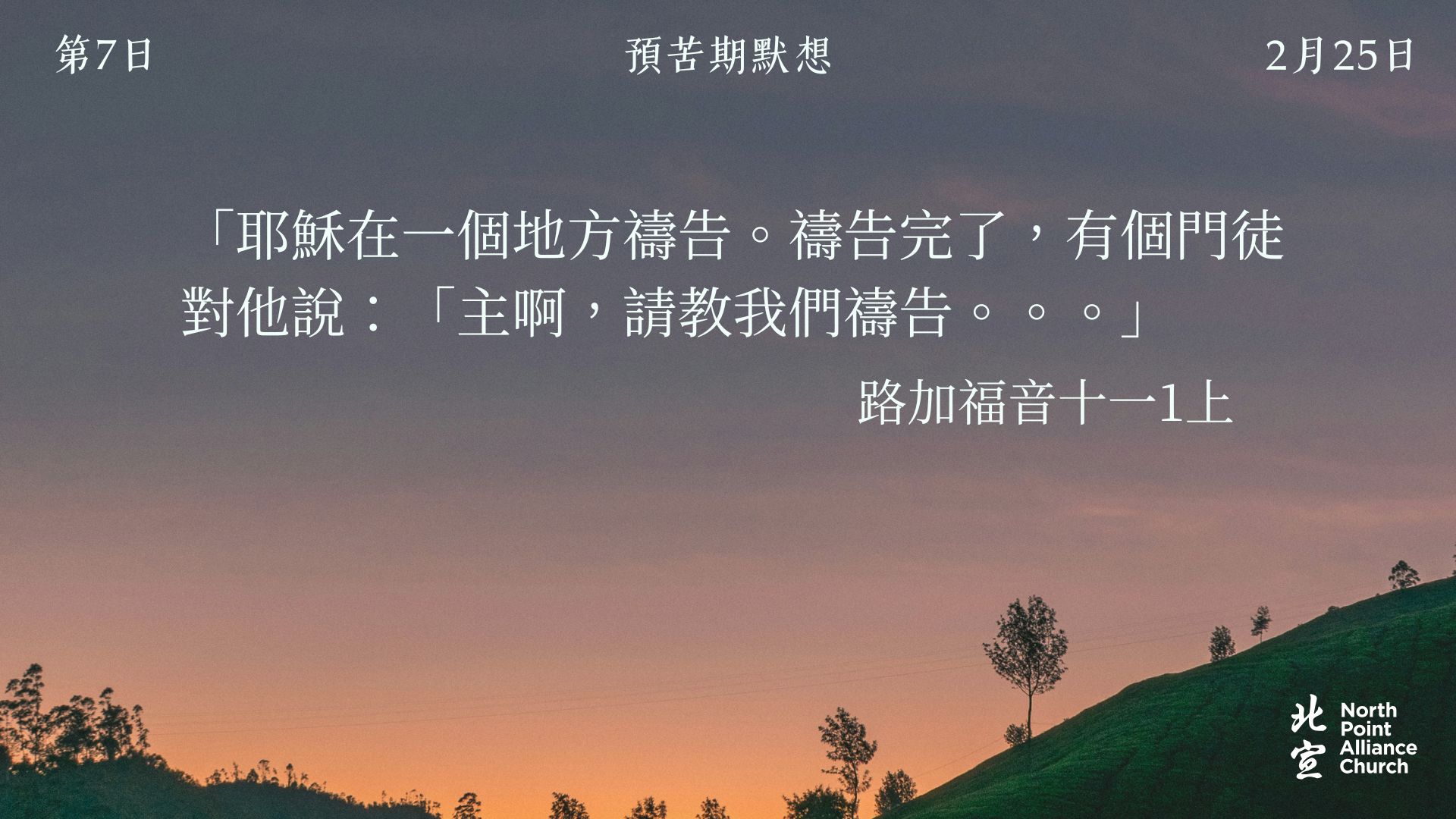 40 天的默想材料將透過北宣網頁和北宣 Connect 每天發放(主日除外),鼓勵弟兄姊妹在期間作「捨棄」或「簡樸」的操練(例:禁食、食素、捨棄一些日常的享受等),實踐在簡樸的操練中儆醒禱告。