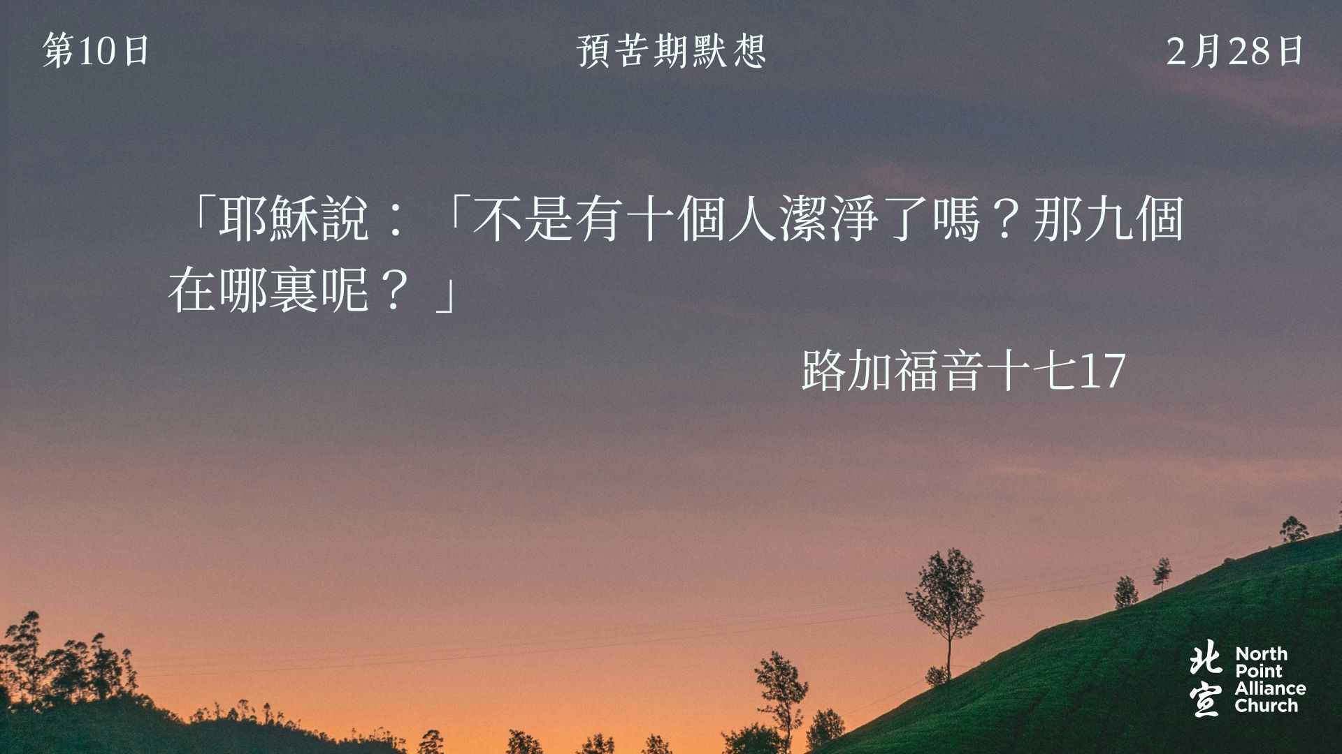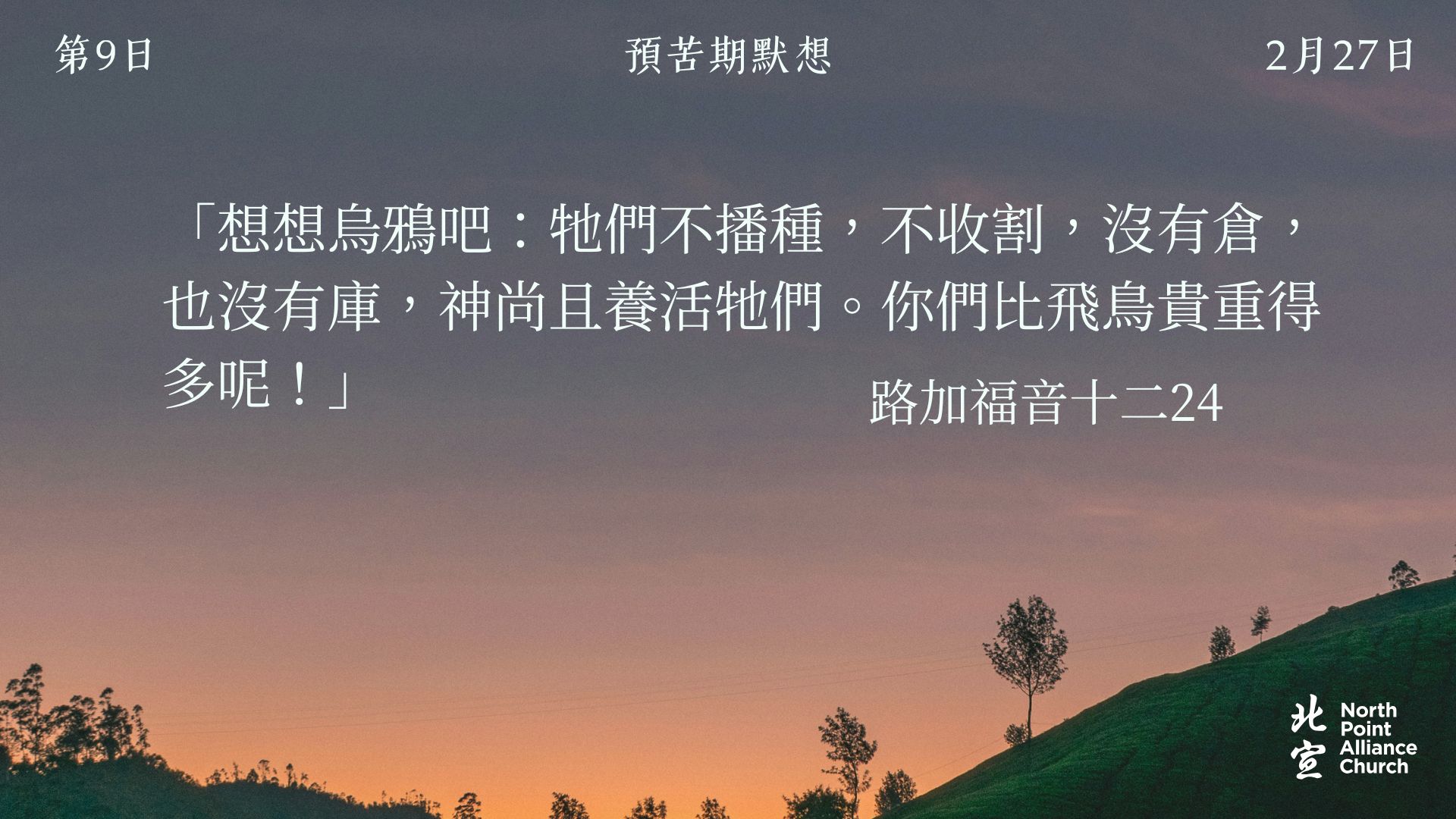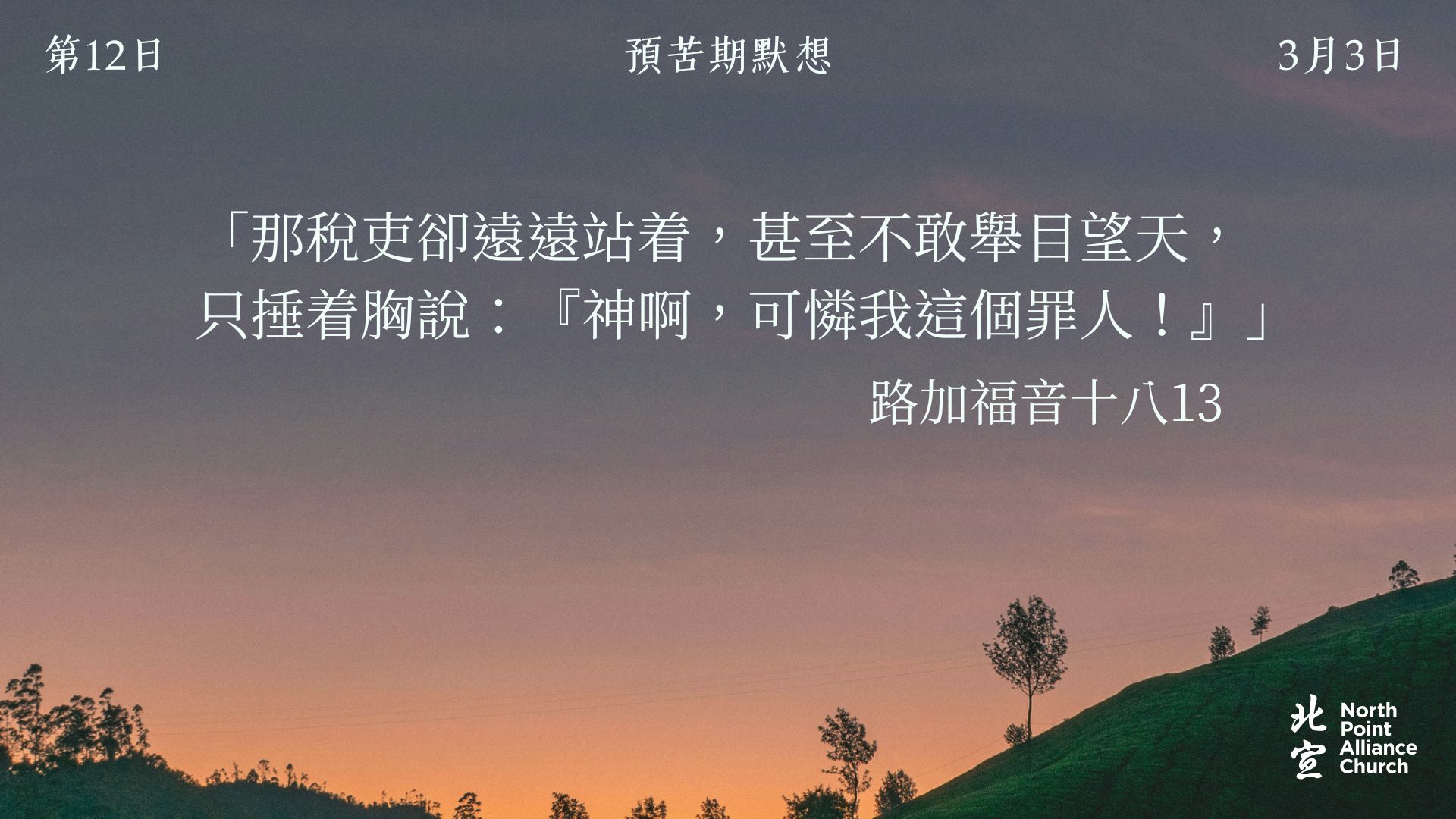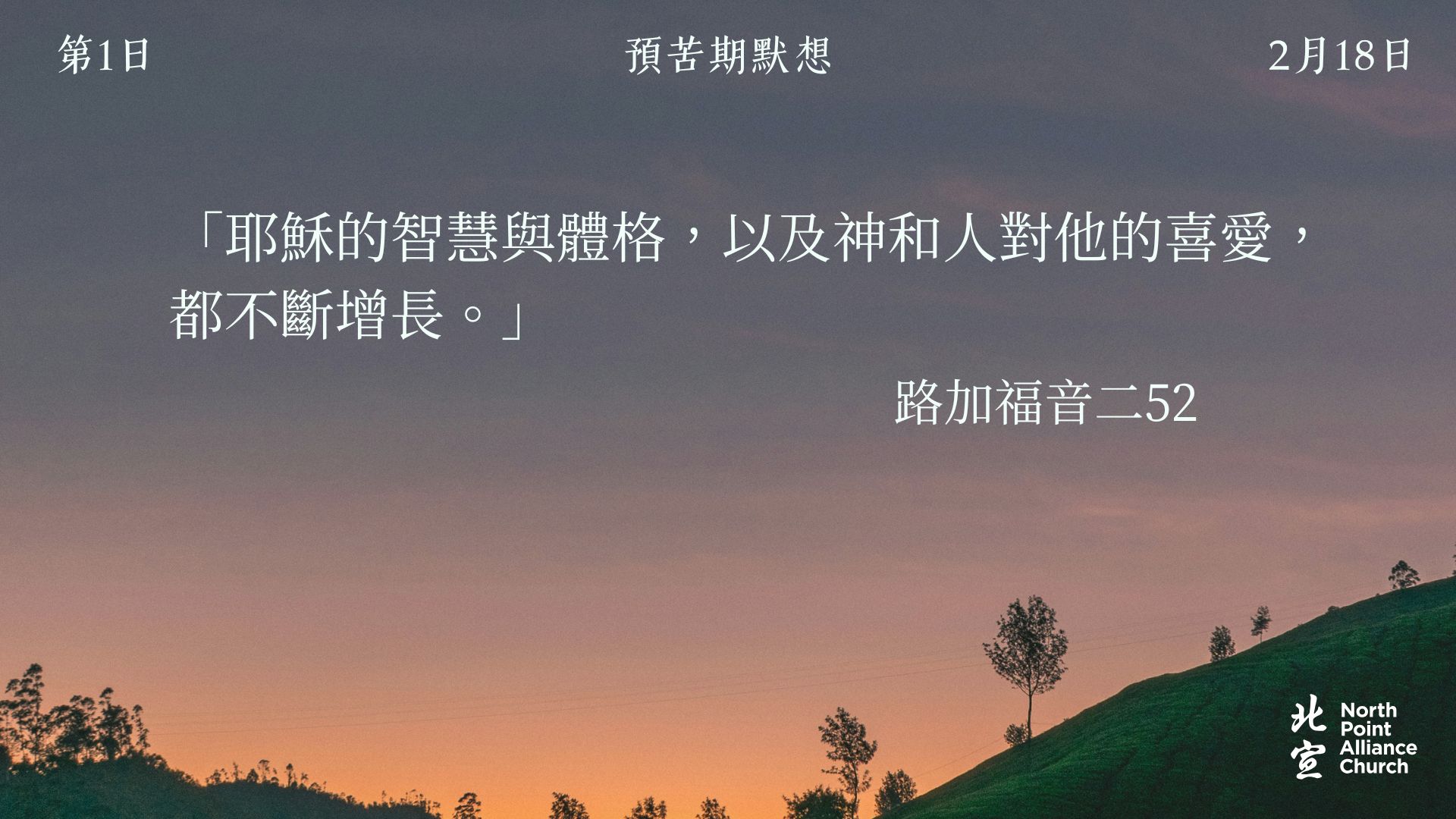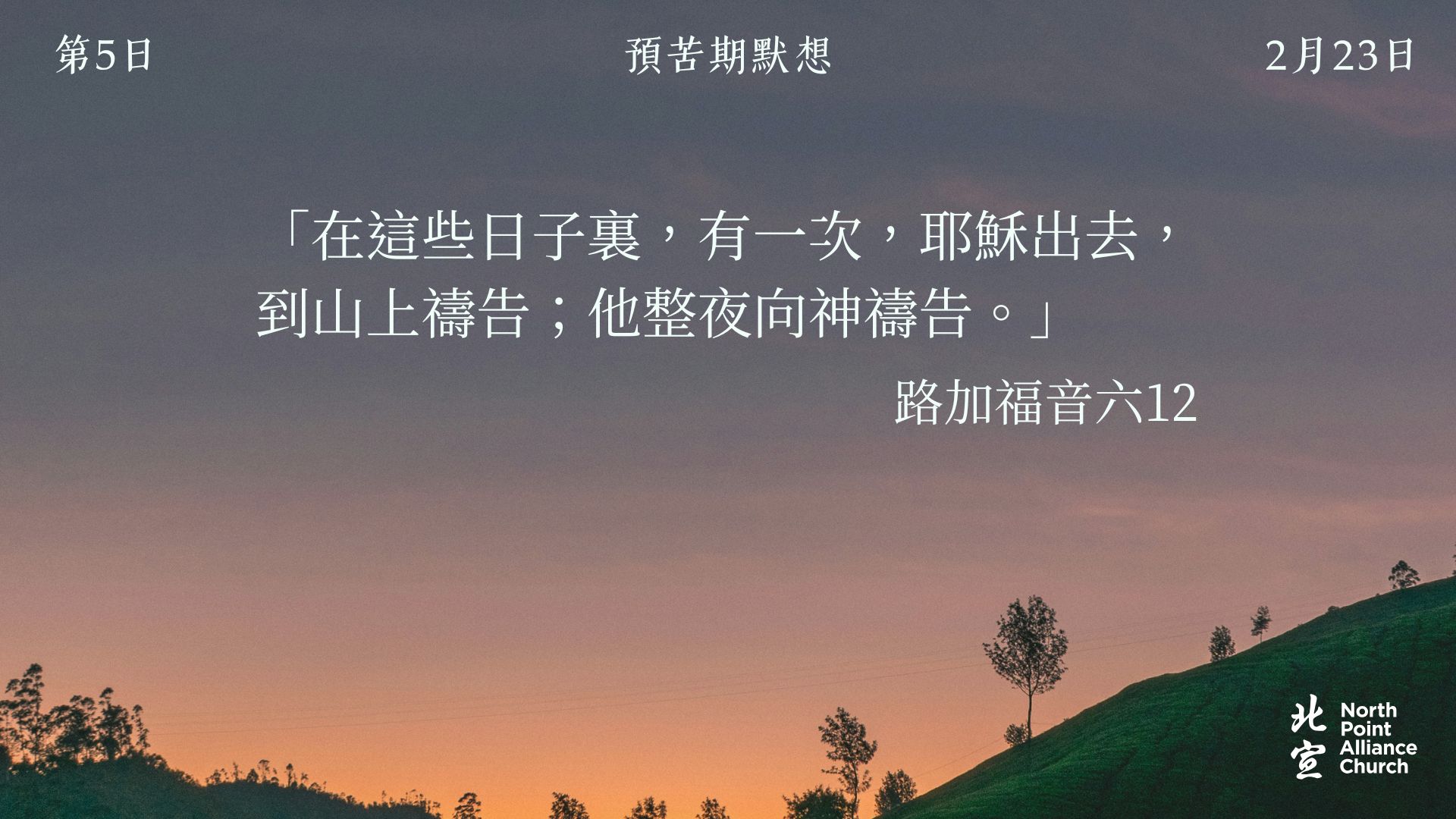 40 天的默想材料將透過北宣網頁和北宣 Connect 每天發放(主日除外),鼓勵弟兄姊妹在期間作「捨棄」或「簡樸」的操練(例:禁食、食素、捨棄一些日常的享受等),實踐在簡樸的操練中儆醒禱告。