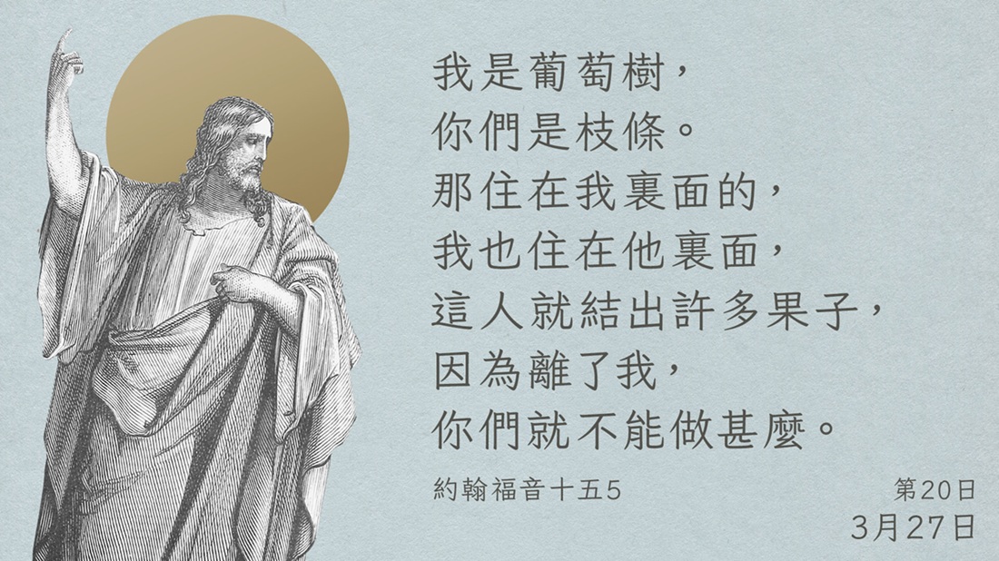 我是葡萄樹,你們是枝條。那住在我裏面的,我也住在他裏面,這人就結出許多果子,因為離了我,你們就不能做甚麼。(約十五 5,新漢語譯本)